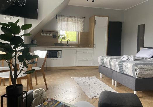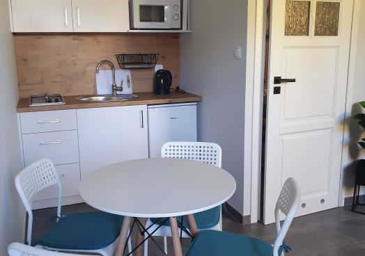 - aneks kuchenny ( lodówka, płyta do gotowania, mikrofalówka, czajnik elektryczny, naczynia, szklanki i sztućce)